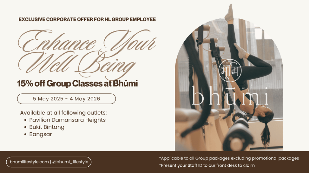 Bhūmi Lifestyle Malaysia, a boutique lifestyle Pilates studio is offering 15% off for Group Pilates class to all Hong Leong Group employees.