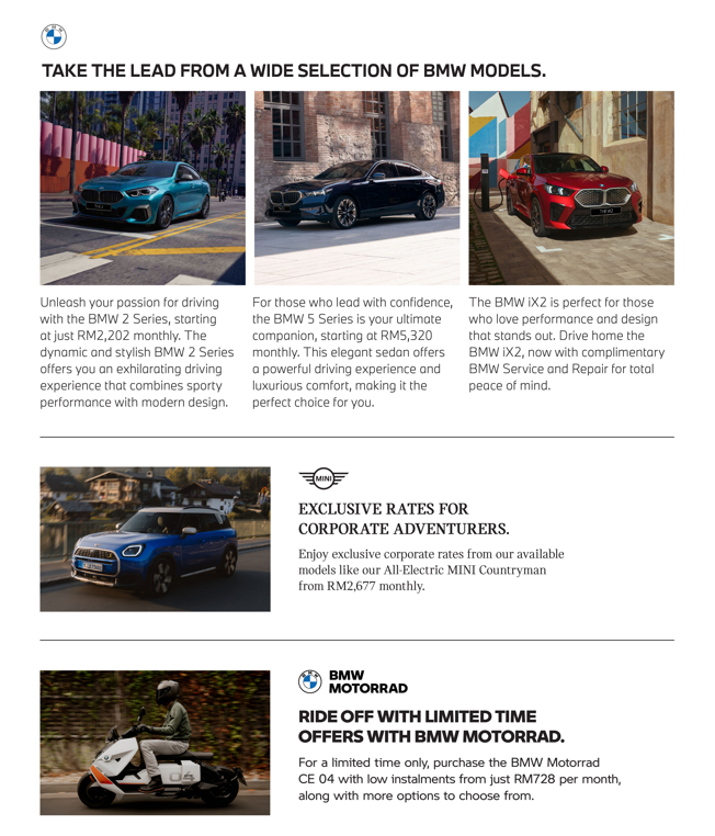 At BMW Group Malaysia, we understand that every business has their unique mobility needs. In our belief in Technology Openness and the Power of Choice, we are offering exclusive and bespoke corporate benefits across BMW, MINI, and BMW Motorrad to enhance your fleet and mobility needs to keep you moving forward.