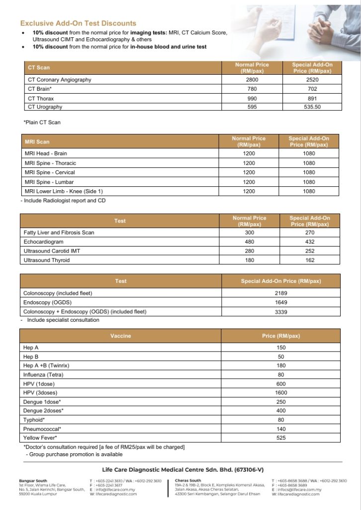 - 10% discount on selected add-on tests, including in-house blood and urine tests as well as imaging tests.