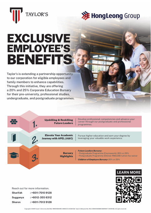 Taylor’s Education Group is offering Hong Leong Group employees and their children a Corporate Bursary of up to 25% on a range of programmes from pre-university, undergraduate, postgraduate and professional studies.