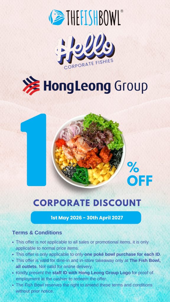 The Fish Bowl is offering Hong Leong Group employees a 10% discount on normal priced items. Choose from its menu of signature creations or customise your own bowl to your liking.