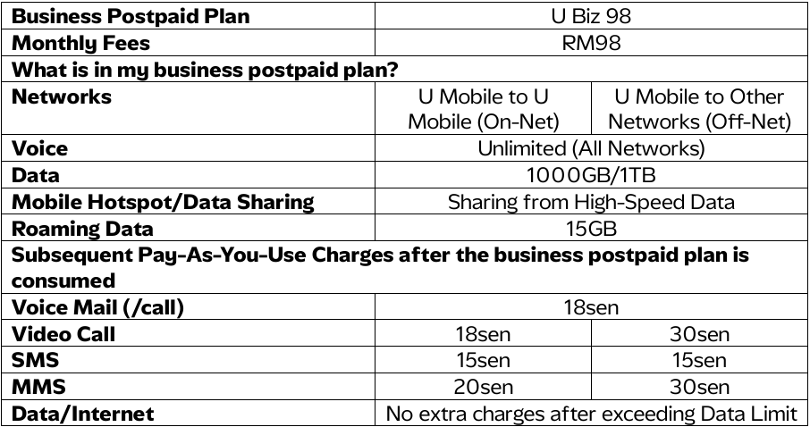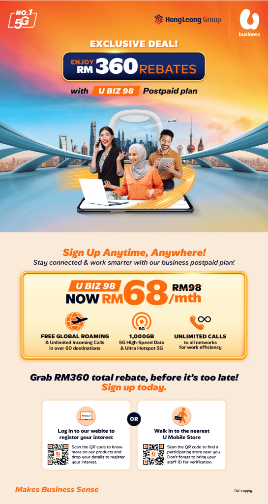 – Enjoy RM30 rebate per line for 12 months on the U Biz 98 SIM plan.