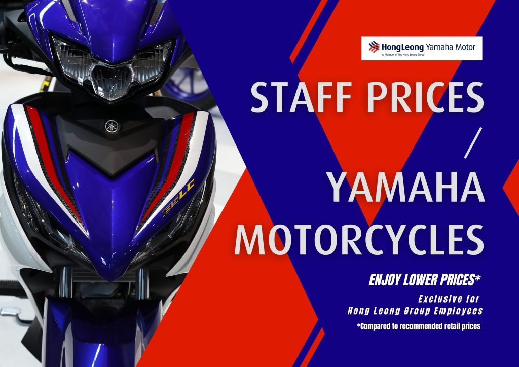 Hong Leong Yamaha Motor is offering staff price for Yamaha motorcycles to Hong Leong Group employees. The staff prices are below the recommended retail prices (RRP) of Yamaha motorcycles of official Yamaha dealers.